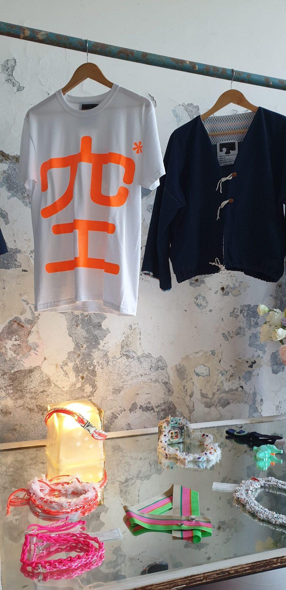Un t-shirt symbolisant l’un des éléments qui inspire cette ligne. Représenté en orange néon et en japonais comme toutes les pièces proposées. Les sens se confondent comme les éléments.