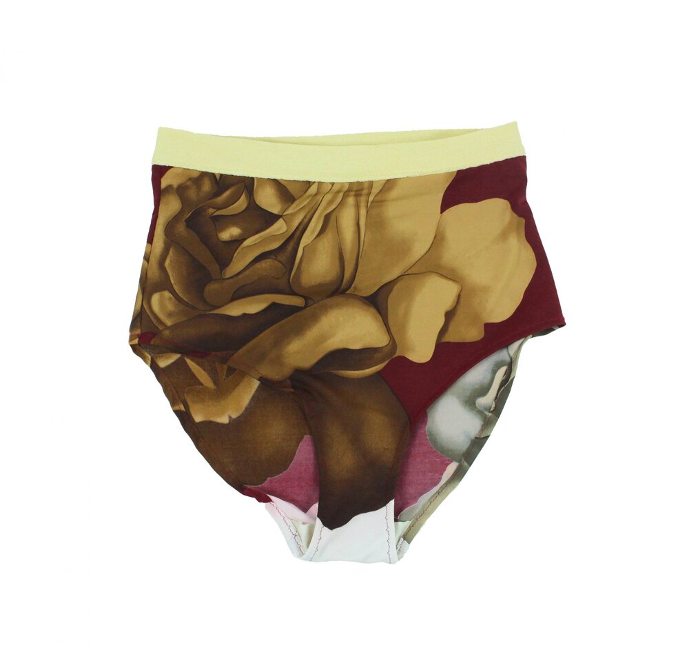Culotte taille haute en jersey lycra imprimé de grandes roses aux coloris dégradés et aux formes évocatrices. Ceinture en jersey bouclé de coton couleur paille. Elle est composée dans une coupe-type d’essais de gamme de motifs, récupéré lors d’un stage en 2003, ce qui en fait une pièce totalement unique.