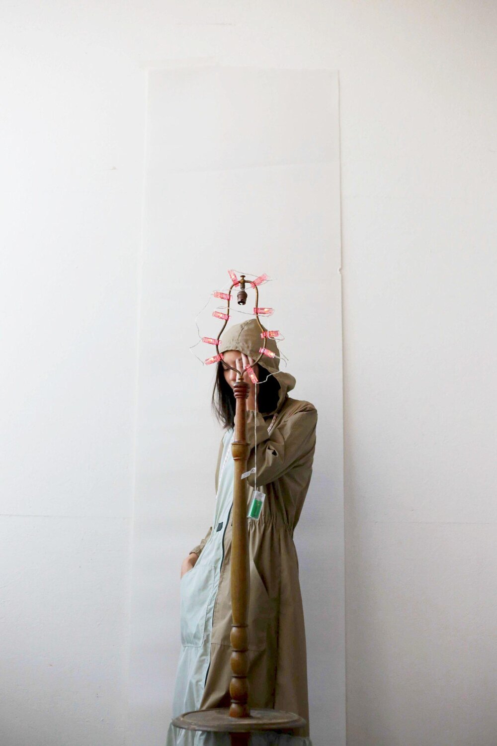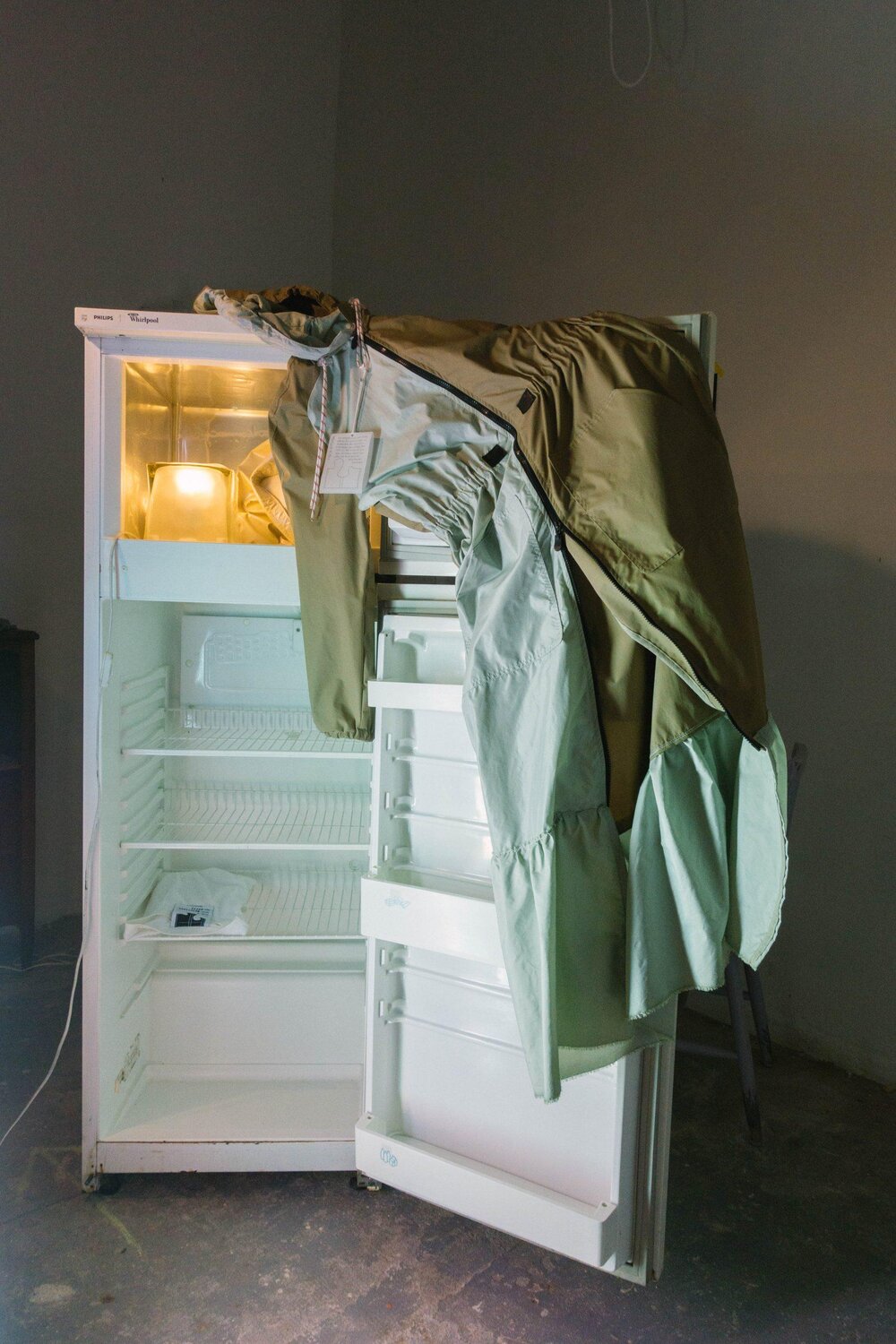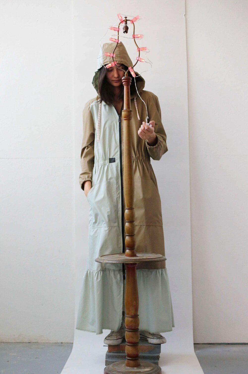 Cette parka a été conçue dans le cadre de l’exposition ¡Tact!, pour un projet autour de la sonorité des textiles. Sa forme et le choix des matières qui la composent sont travaillés pour exalter le bruissement qui se dégage de la pièce, tout en créant un vêtement fonctionnel pensé pour la pluie.