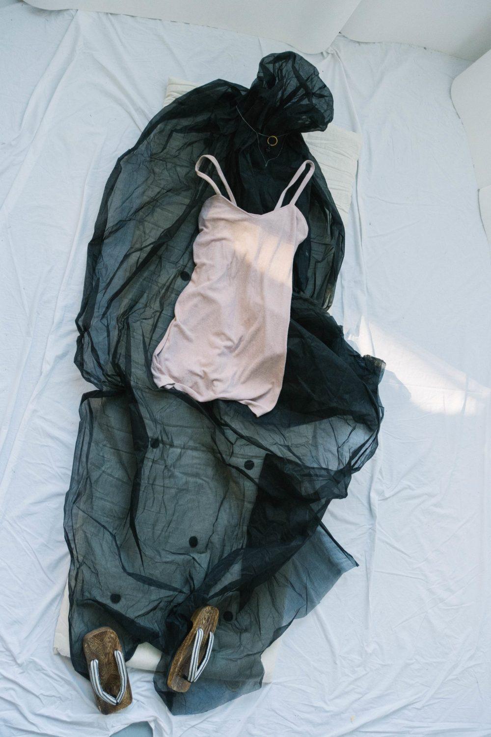 Robe à bretelles en jersey-éponge couleur glycine fanée. Décolleté triangles-arrondis, elle est échancrée dans le dos et aux emmanchures. Longueur au dessus du genoux.