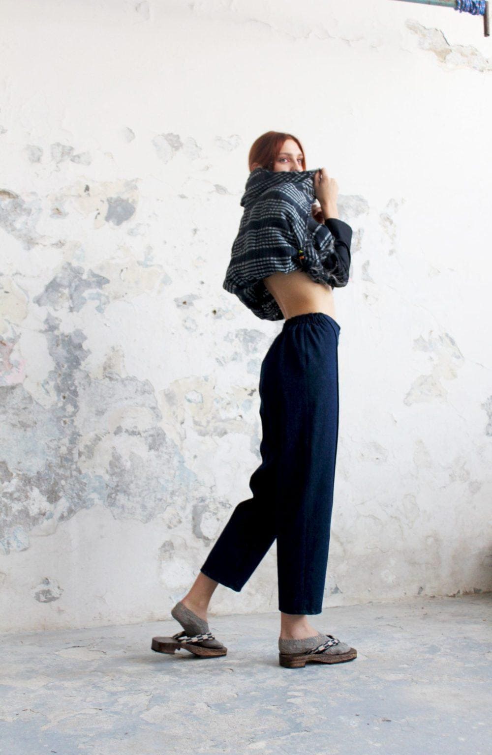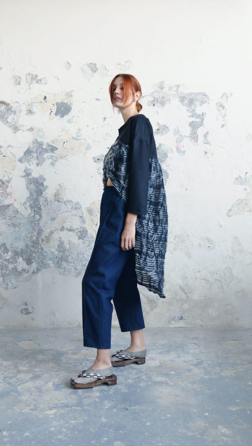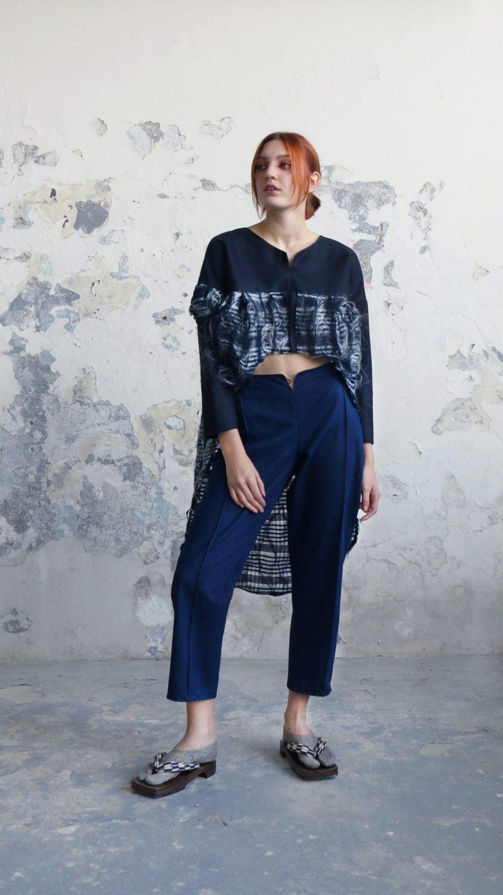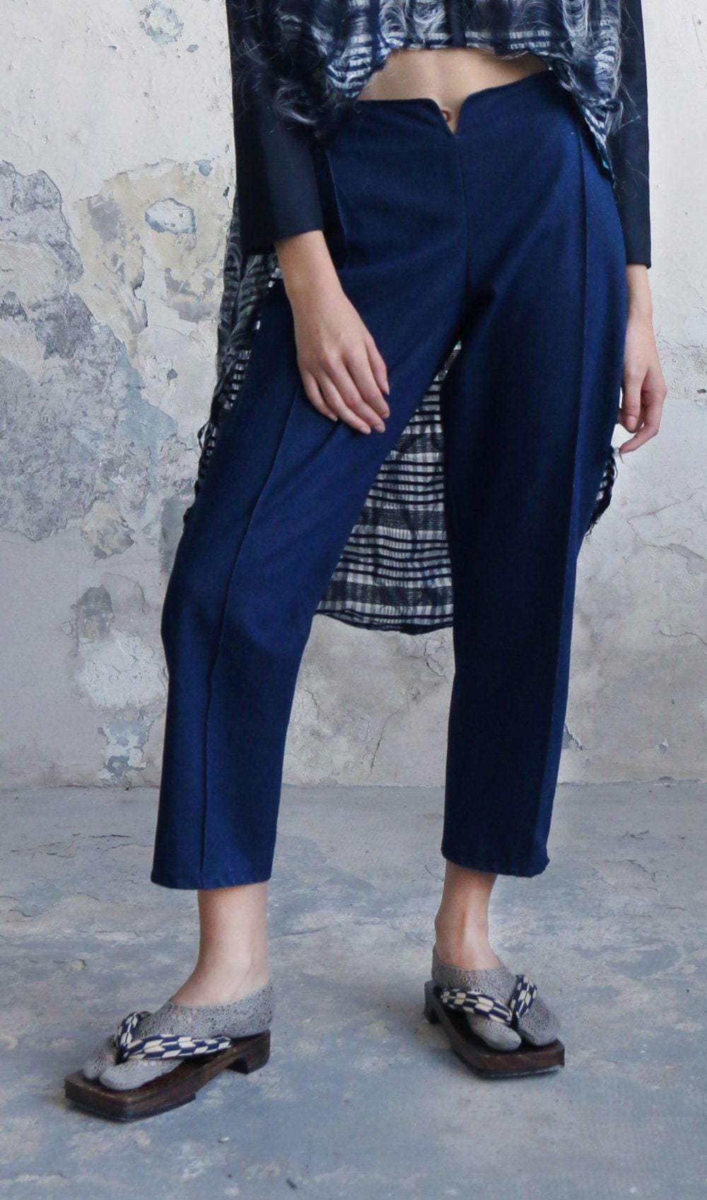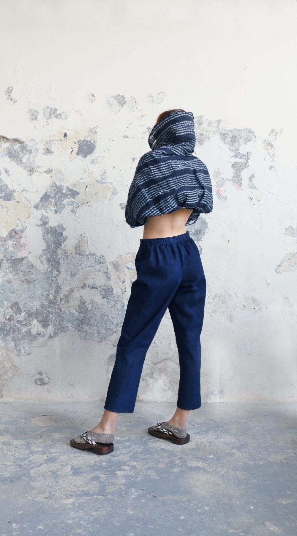 Unéri, comme la petite houle qui caresse la mer symbolisée ici par cette fente arrondie à la ceinture qui souligne le nombril. Un jeans brut indigo à la taille élastique et bordé d’une nervure-crête sur le milieu devant de la jambe. La ceinture est soigneusement doublée par un vichy de coton encre.