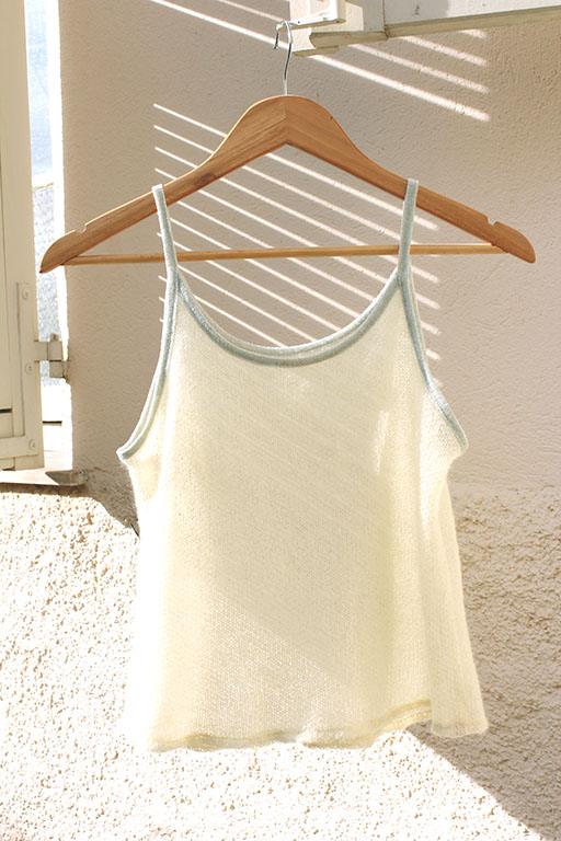 Caraco en mohair couleur paille au point mousse aéré et à la coupe sportive, souligné de bords en éponge vert amande. Il est tricoté à la machine manuelle dans un fil doux issu de stocks délaissés par l’industrie textile.