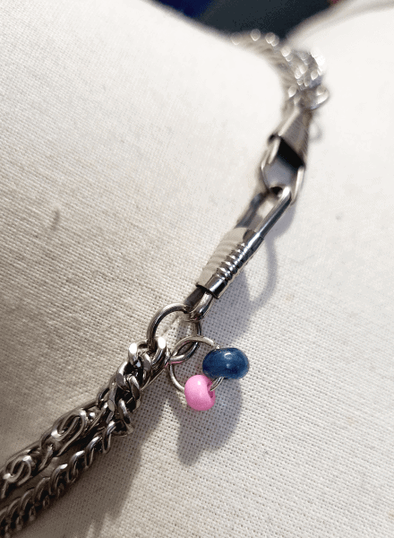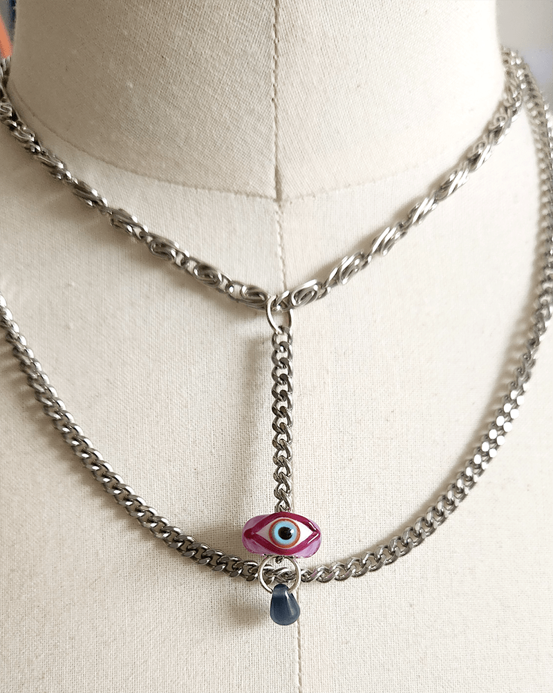 Ce collier unique, conçu comme un talisman, entremêle plusieurs références. Il est composé de deux types de chaînes argentées, toutes deux chinées en brocante, et qui sont agencées de sorte à créer un balancier pour suspendre la perle centrale. Celle-ci, en forme d’œil aux teintes magenta et à l’iris bleu perçant, est bercée au gré des mouvements et se termine par une petite perle-larme aux reflets irisés, en œil de chat, pierre semi-précieuse, dont les vertus protectrices sont connues pour évacuer l’anxiété.