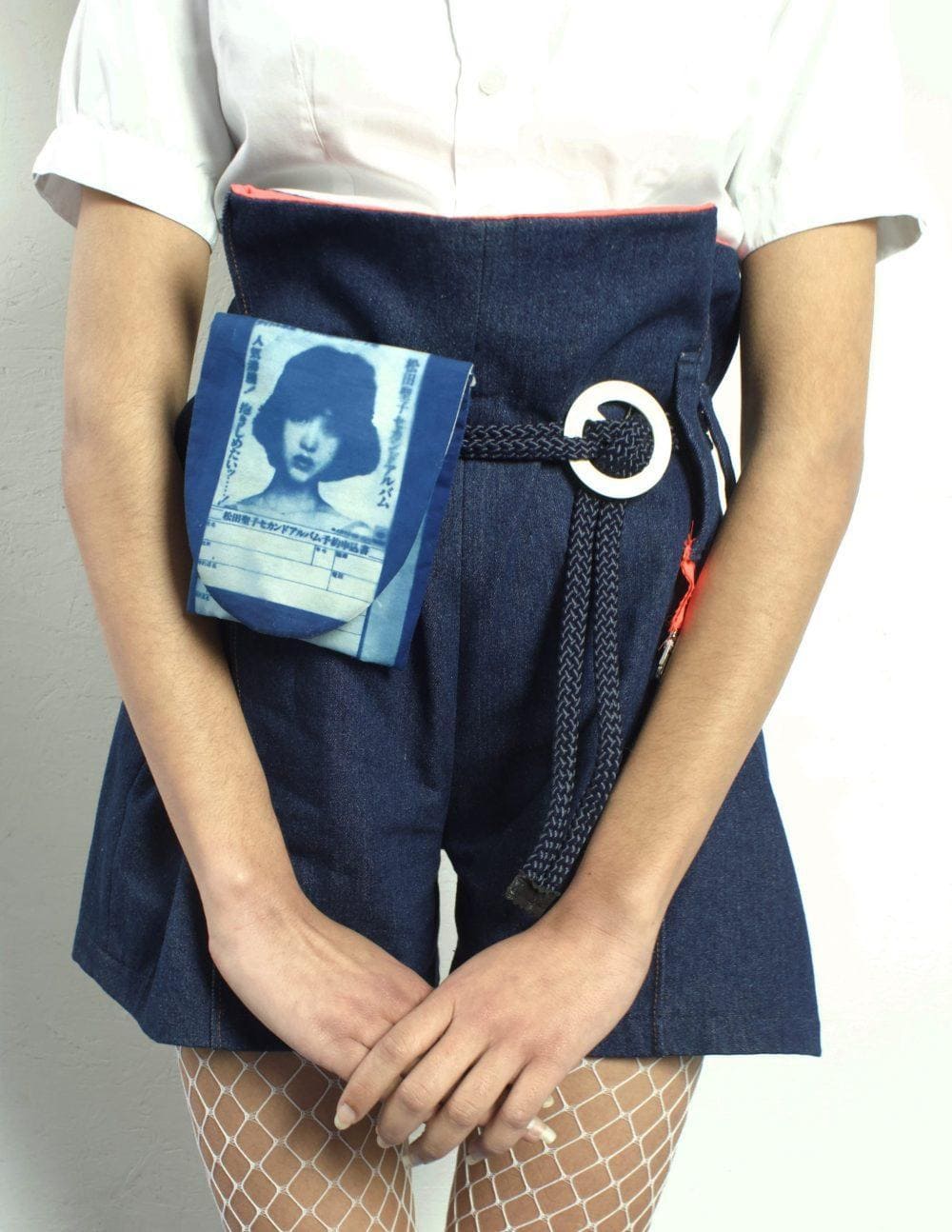 身元, se dit mimoto qui signifie « identité », représentée dans l’imprimé de cette petite pochette en coton. Elle est réalisée artisanalement avec un procédé photographique ancien qui apporte un effet flou et suranné. Unique, elle reprend des images qui me sont chères, ici le visage d’une jeune japonaise dans un cartouche. Elle se porte à la ceinture, maintenue par un passant à l’arrière et sa fermeture est aimantée. La ceinture se compose de cordons tressés épais de couleur marine et d’une boucle ronde vintage en plastique écru ajustable selon la taille. C’est un accessoire unique et indispensable pour garder vos essentiels près de vous en toutes situations.
