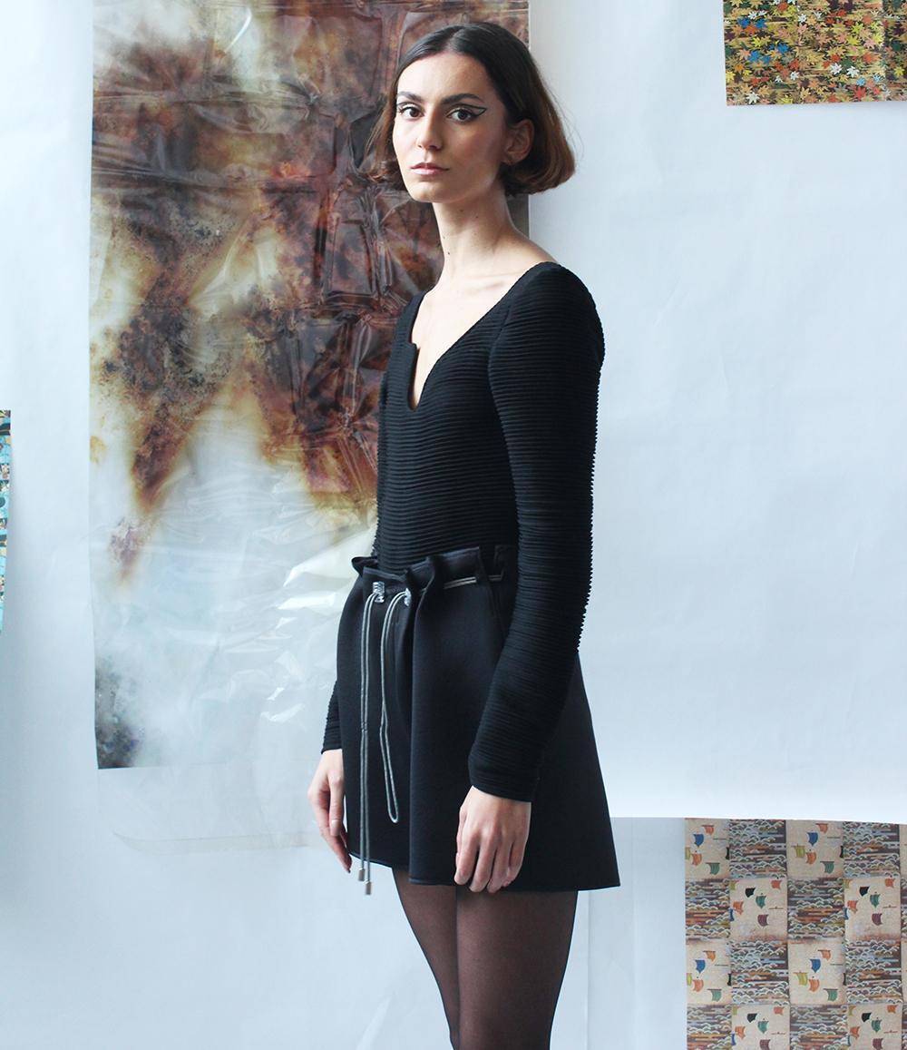 Ces cordons sont les conducteurs de toute la ligne depuis les débuts de ce projet. Ils représentent l’aspect réglable, point important dans la conception des pièces, ils procurent confort et justesse mais offrent aussi différentes façon d’être porté. Ici, ils sont utilisés en un jeu de passe-passe au travers de boutonnières afin de laisser apparaître l’envers du Néoprène de couleur contrastée.